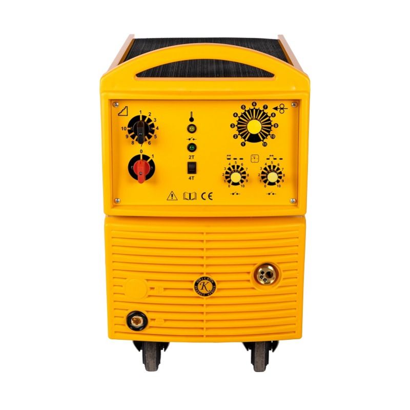 Invertorová svářečka na MIG/MAG svařování nízkolegovaných a konstrukčních ocelí. Elektronické nastavení délky bodu, pomalých pulzů a přepnutí do režimu 4T, funkce řízené mikroprocesorem. Zatěžovatel 60 % = 210 A, 100 % = 180 A.