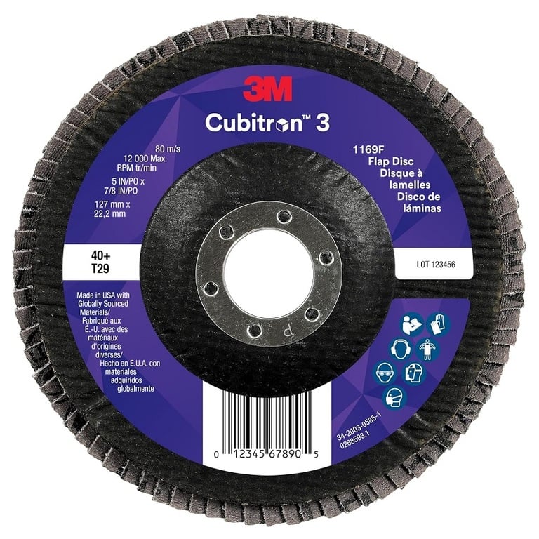 Špičkový, vysokovýkonný lamelový brúsny kotúč 1169F 3M Cubitron 3 na uhlíkovú oceľ, nehrdzavejúcu oceľ a zliatiny citlivé na teplo, pre aplikácie so stredným až vysokým tlakom. Pre použitie pri strmších uhloch 15° – 25°.