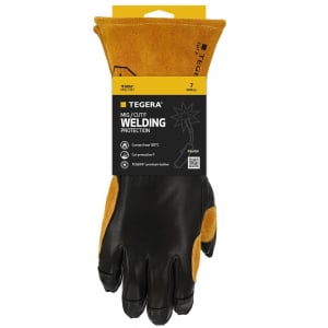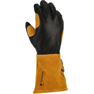 Zváračské rukavice TEGERA 7787 odolné proti prerezaniu a kontaktnému teplu do 100 °C. Prémiová kozia koža, vlákna KEVLAR, spevnený ukazovák, švy, prsty a palec, dokonalý strih.