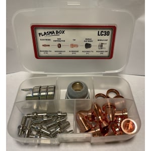 Štartovacia sada Lincoln Electric PLASMA BOX pre plazmový horák LC30. Obsahuje plazmové elektródy, difúzory plynu, hubice a nadstavce.