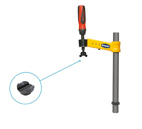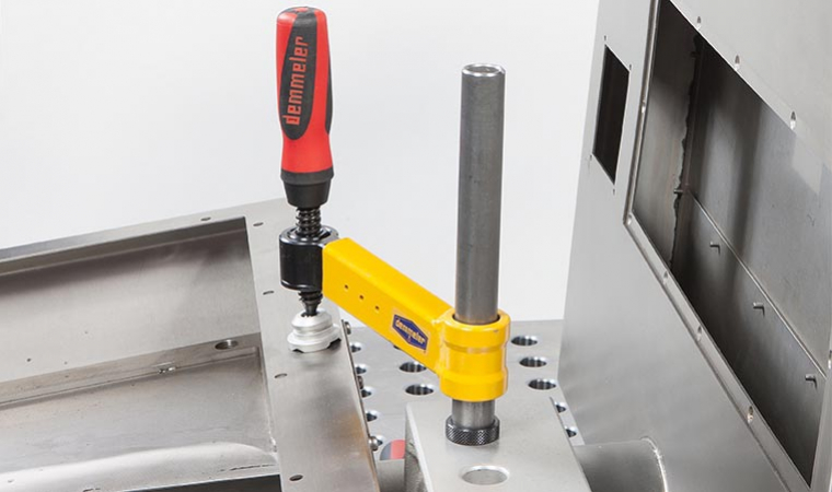 Skrutkovacia svorka na rýchle, silné a polohovo presné upnutie obrobkov, pre profily so sklonom k prevráteniu. Pre zváracie stoly so systémom otvorov D22.