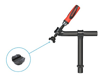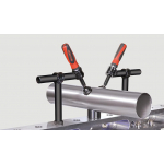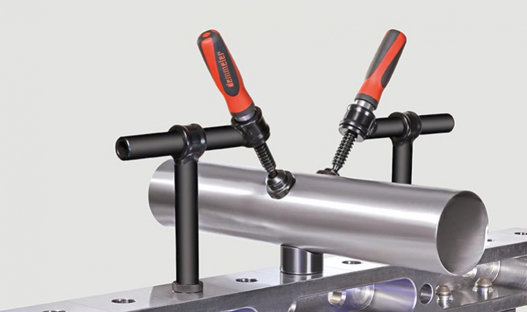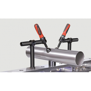 Svorka na rýchle, pevné a presné upínanie prizmatických profilov, ako aj pravouhlých alebo štvorcových profilov, na presné uchytenie obrobkov a dielov na zváracie stoly so systémom otvorov 22