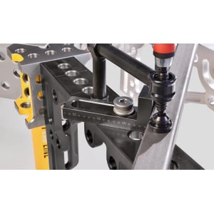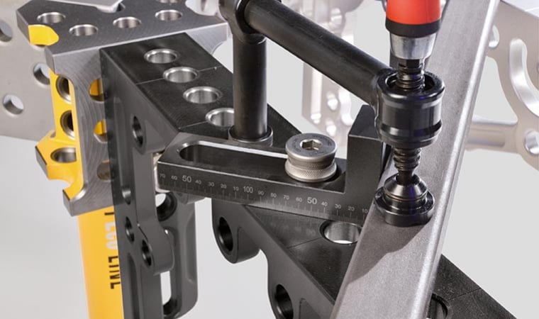 Uholník PROFIPlusLINE z brynierovanej ocele na presné upínanie obrobkov na zvárací stôl so systémom otvorov 16, ideálny pre stiesnené priestory.