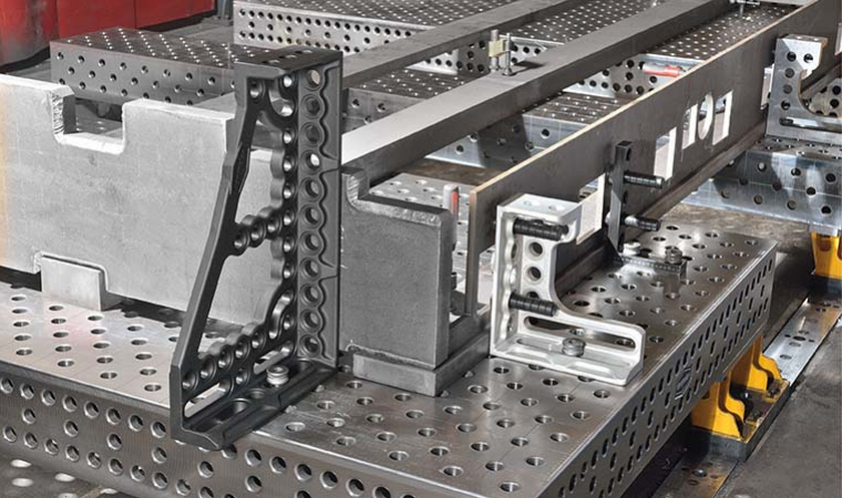 PROFIPremiumLINE uholník z liatiny na presné upínanie obrobkov na zvárací stôl so systémom otvorov 28. Používa sa napríklad ako doraz, rozšírenie stola alebo na upevnenie uhlových obrobkov pod uhlom 90°.