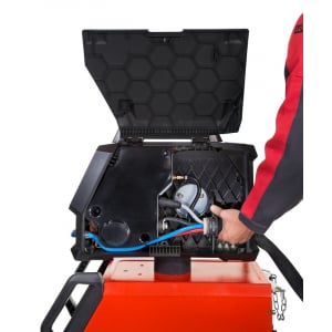 Vďaka obojstranne výklopným bočným krytom s aretáciou máte veľmi dobrý prístup do vnútorného priestoru podávača a veľmi ľahko vymeníte ľahko našikmo umiestnenú cievku drôtu.